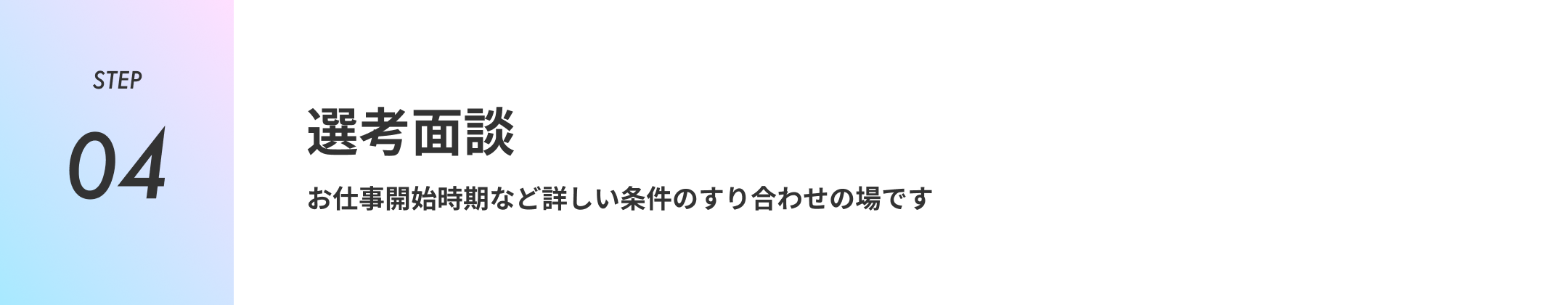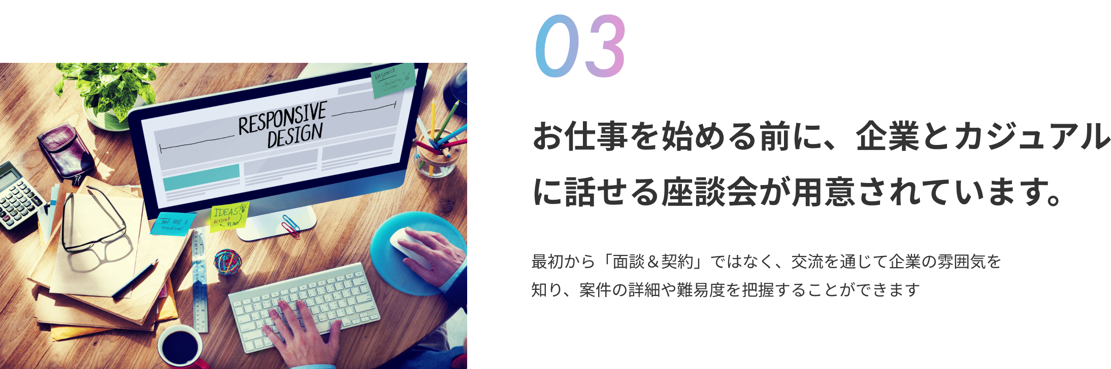 A: 案件によっても前後しますが、面談終了後、早ければ1週間後にはお仕事開始となるケースもあります。デザイン募集している企業と直接相談しながら決めていきます。