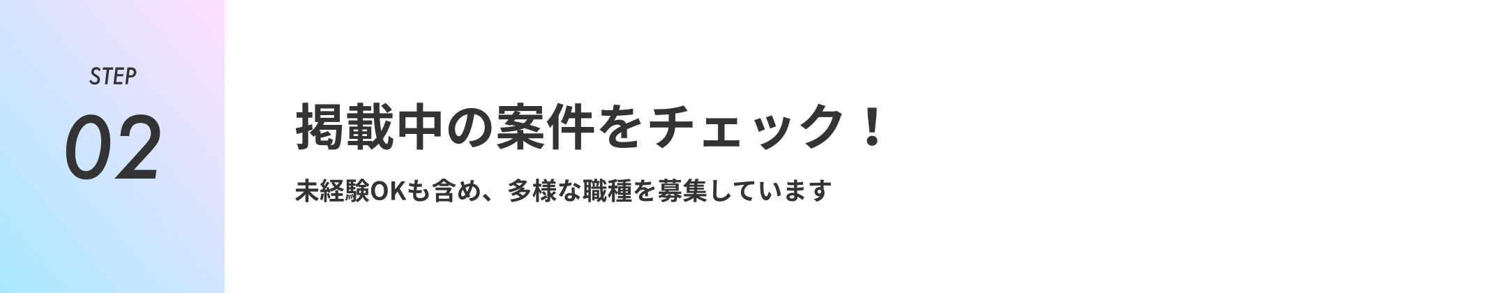 A: 未経験の職種でもご応募は可能です。なぜその案件にご興味をもたれたのか、エントリー時の自己PRコメントで熱意をアピールし ましょう!